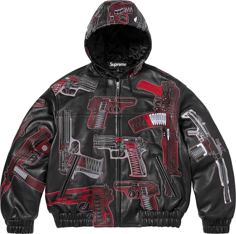 アメリカのアーティスト「アルフレッド・マルティネス」による、拳銃アートを総柄で刺繍したラムスキンレザー仕立てのフーデッドジャケット。