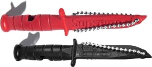 アメリカの老舗ナイフブランド「ケーバー」製、緊急時にはホイッスルとして使用可能なナイフ形のキーチェン。立体的なエンボスロゴ入り、大きさ約9.5cm