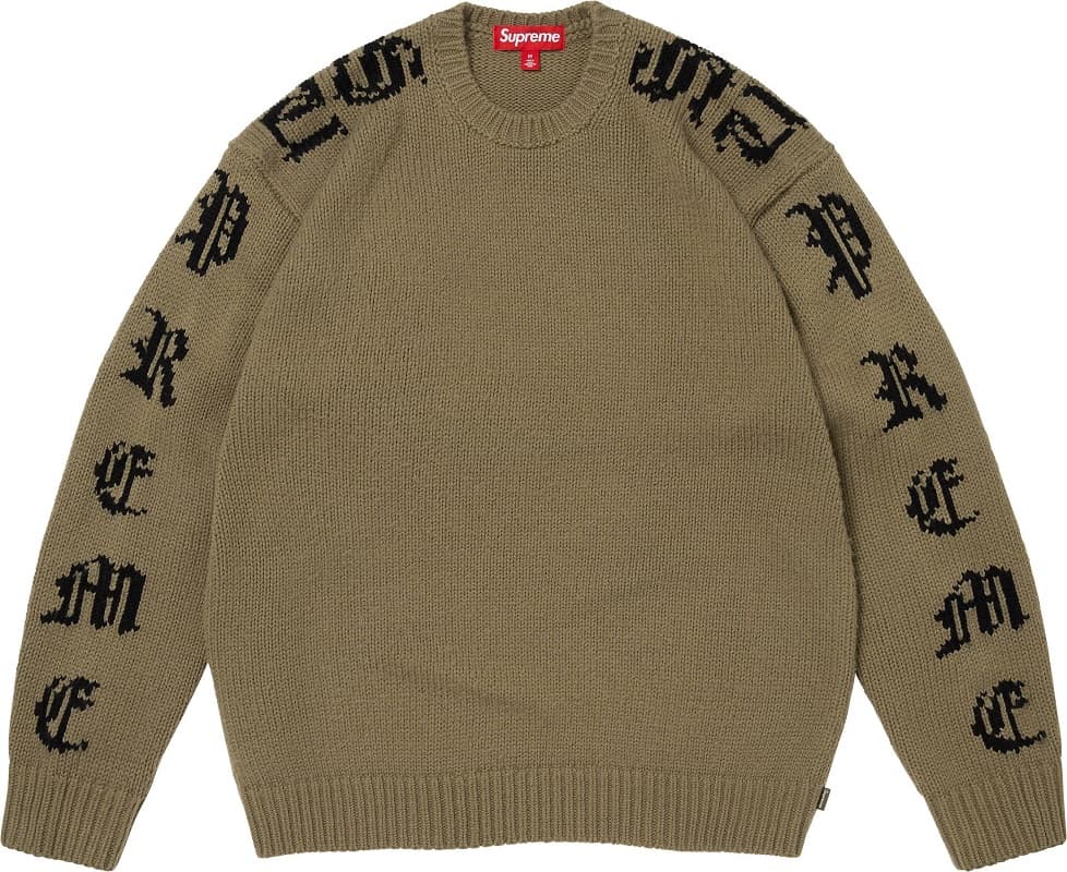 両袖にカラフルなオールドイングリッシュロゴを編み込んだアクリル素材のセーター。