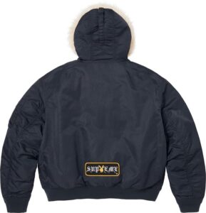 プレイボーイのラビットヘッドのワッペンが目を引く、耐水ナイロン素材の中綿入りMA-1ジャケット。フライトジャケットの名門アルファ社製、フードのファーは着脱可能。