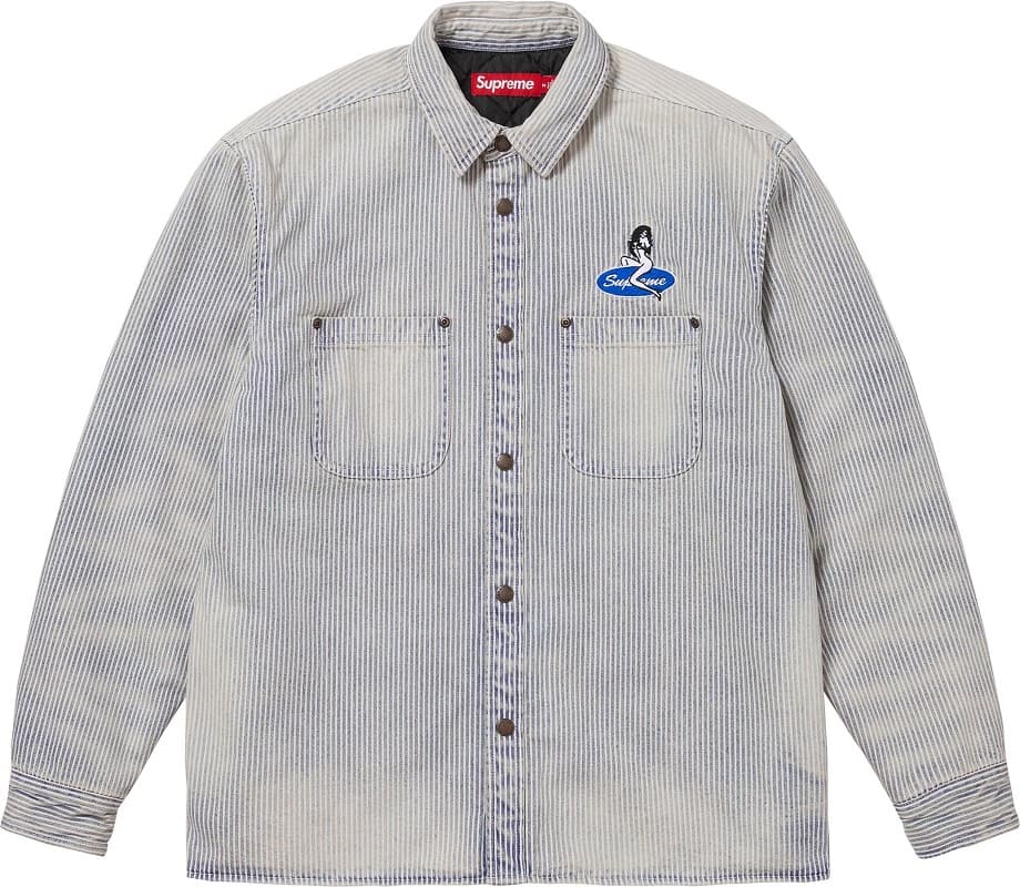 ピンナップガールのワッペンを施したキルティングライナー付き、10オンスデニム素材のスナップフロントシャツ。