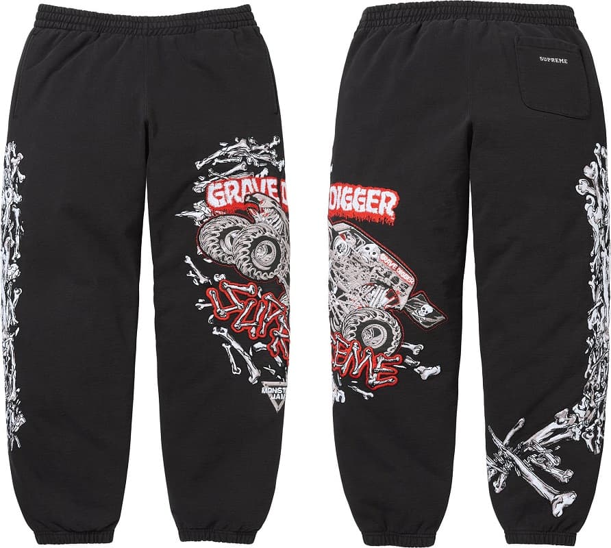 グレイブディガーのグラフィックを刺繍したスウエットパンツと、骨の障害物を乗り越えるグレイブディガーを刺繍したスウエットパンツ。