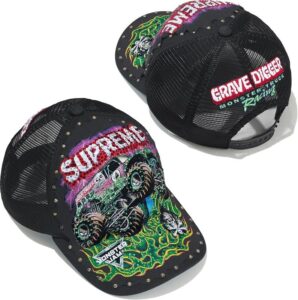 スタッズやラインストーンで装飾したグレイブディガーのグラフィック刺繍をフロントからバイザーにかけて施したメッシュバック5パネル。