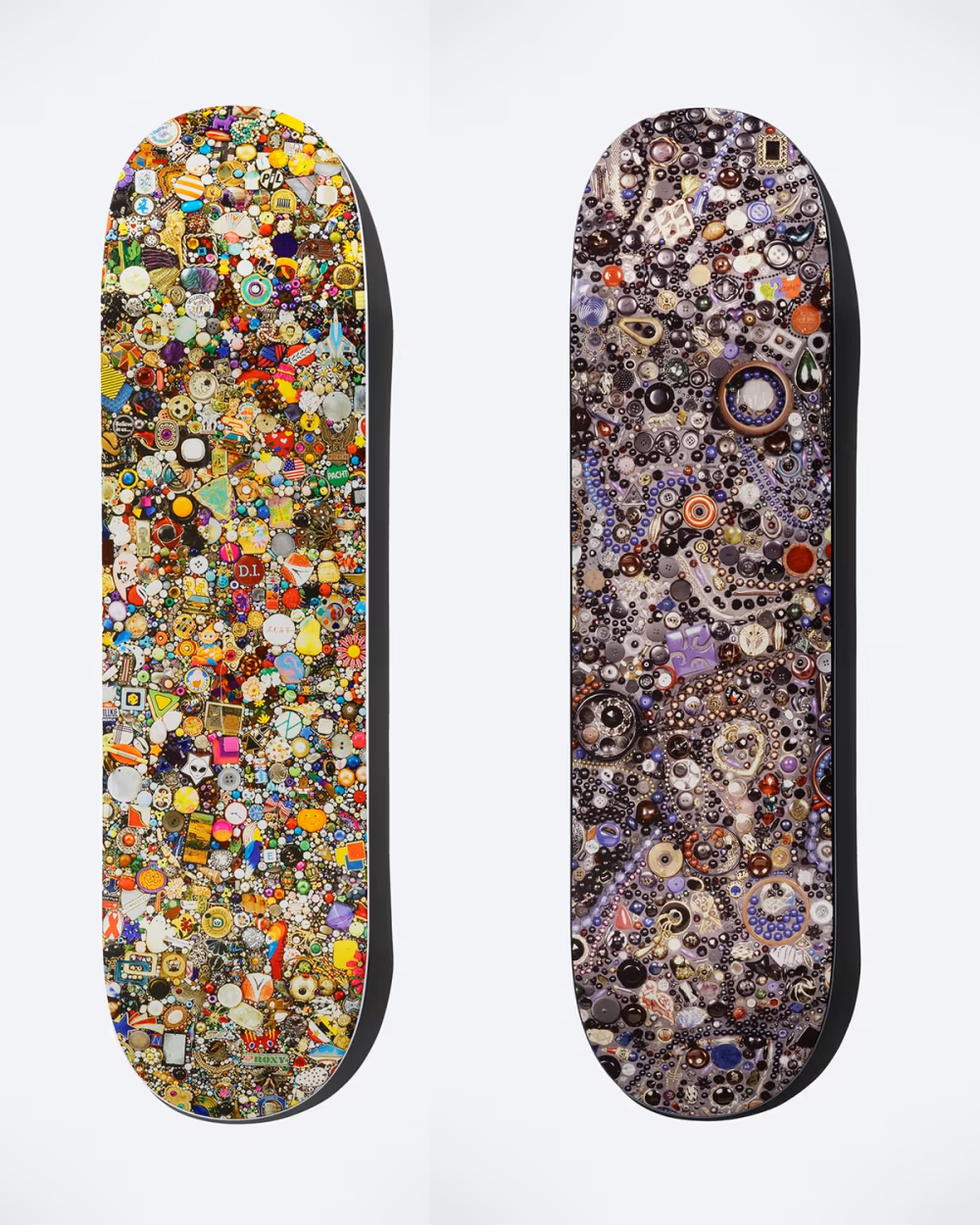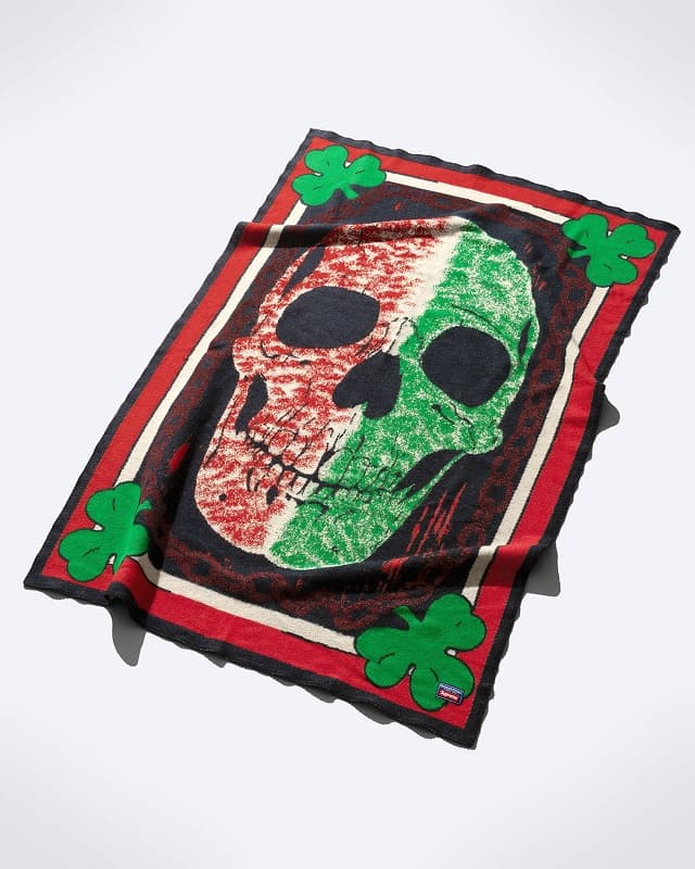 マークケリーによるドクロのグラフイックを落とし込んだファリバルトウーレンミルズ製ブランケットと、マークケリーのアートワークを総柄で落とし込んだスケートボードデッキ。