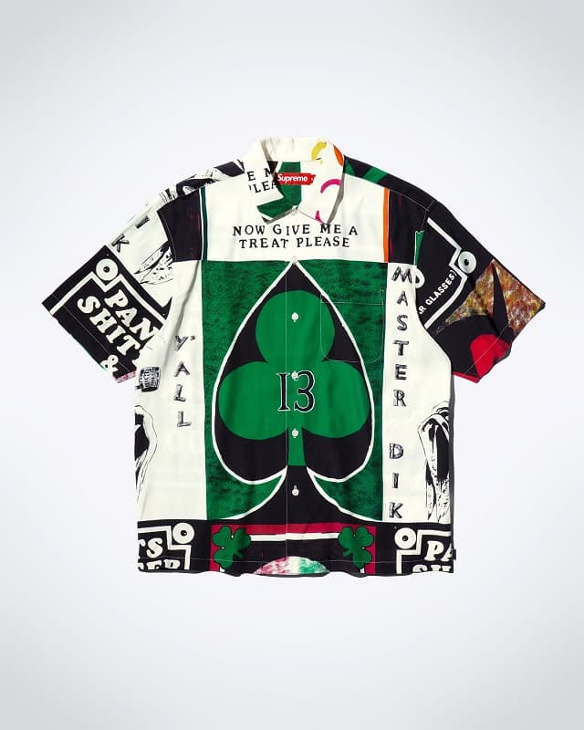 マークケリーによるクローバーやアクセサリーのアートワークを落とし込んだ総柄のレーヨンシャツ。