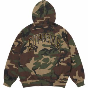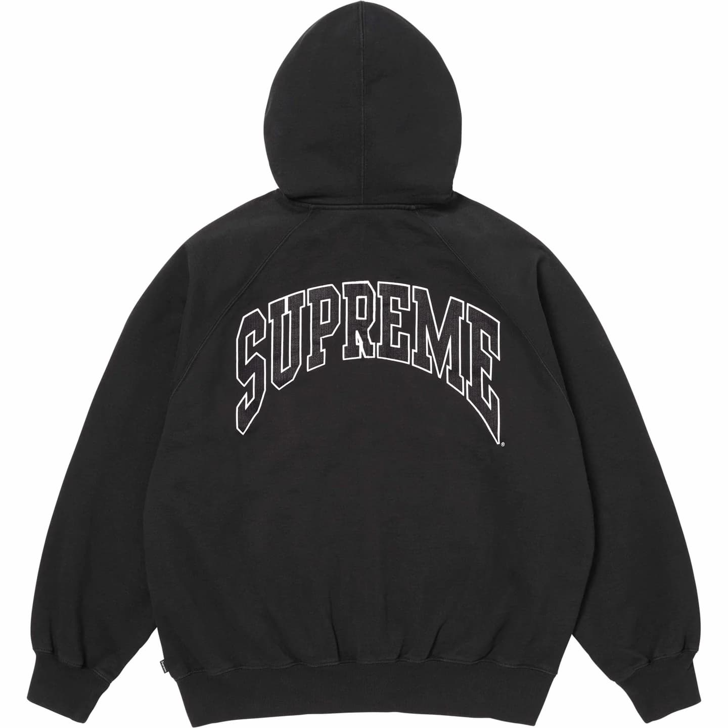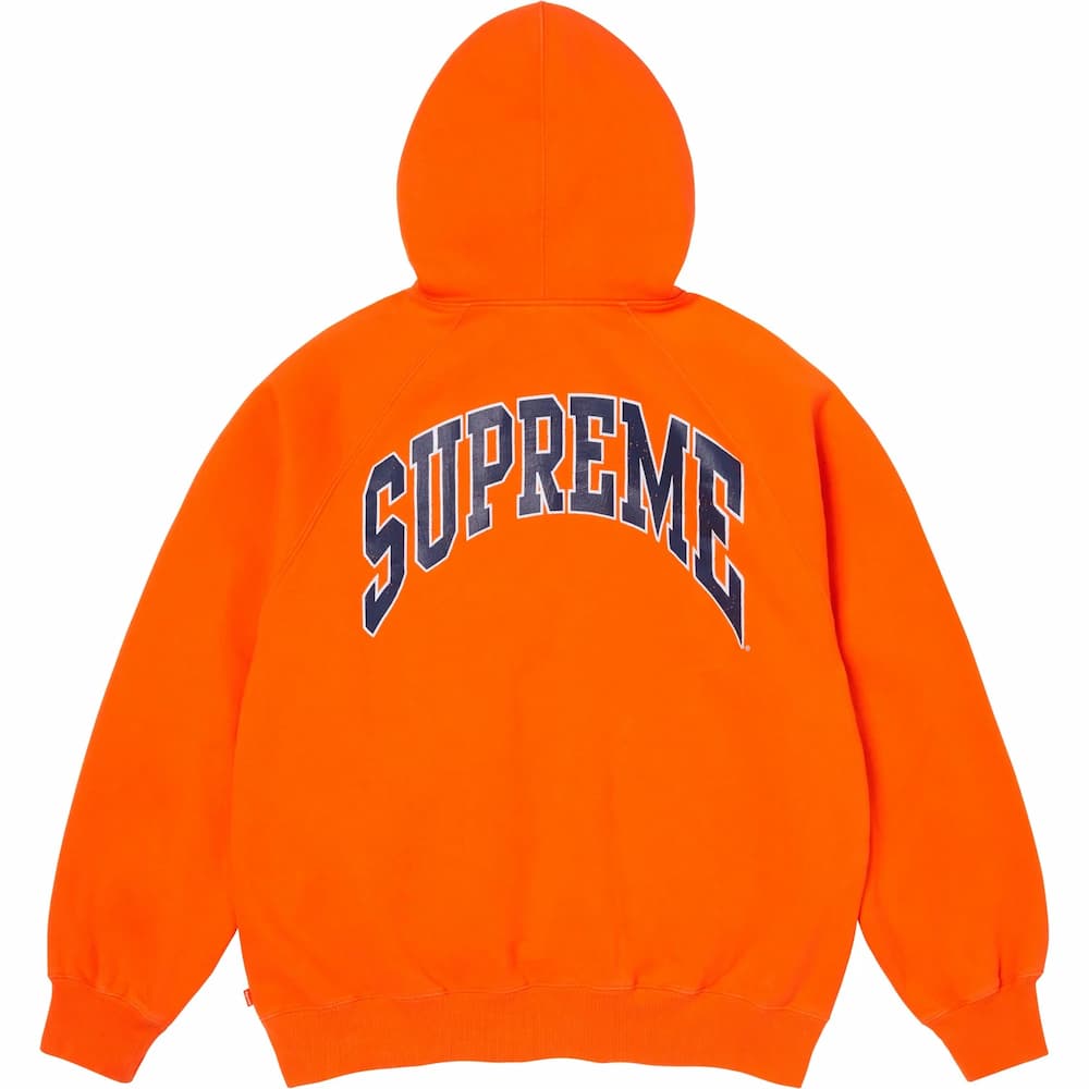 クラック加工のアーチロゴでヴィンテージ感を演出したラグランスリーブ仕様のジップアップフーディ。