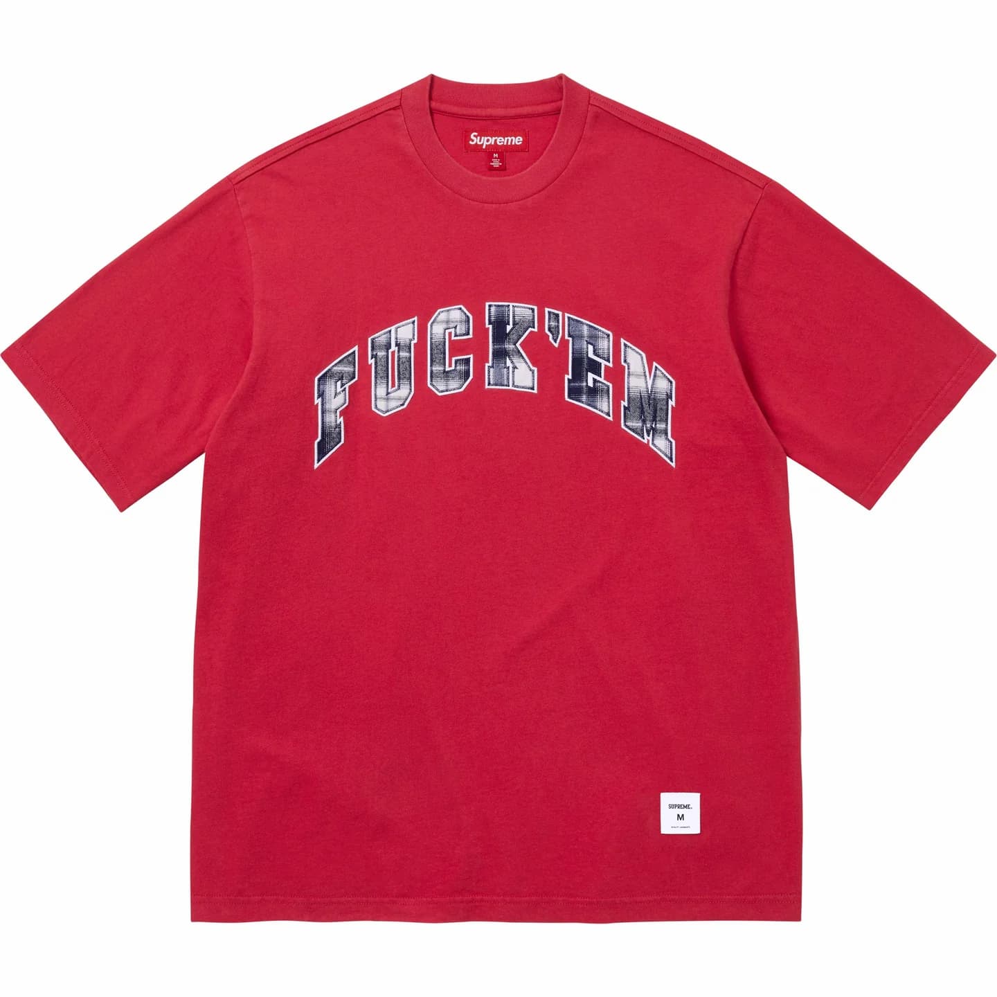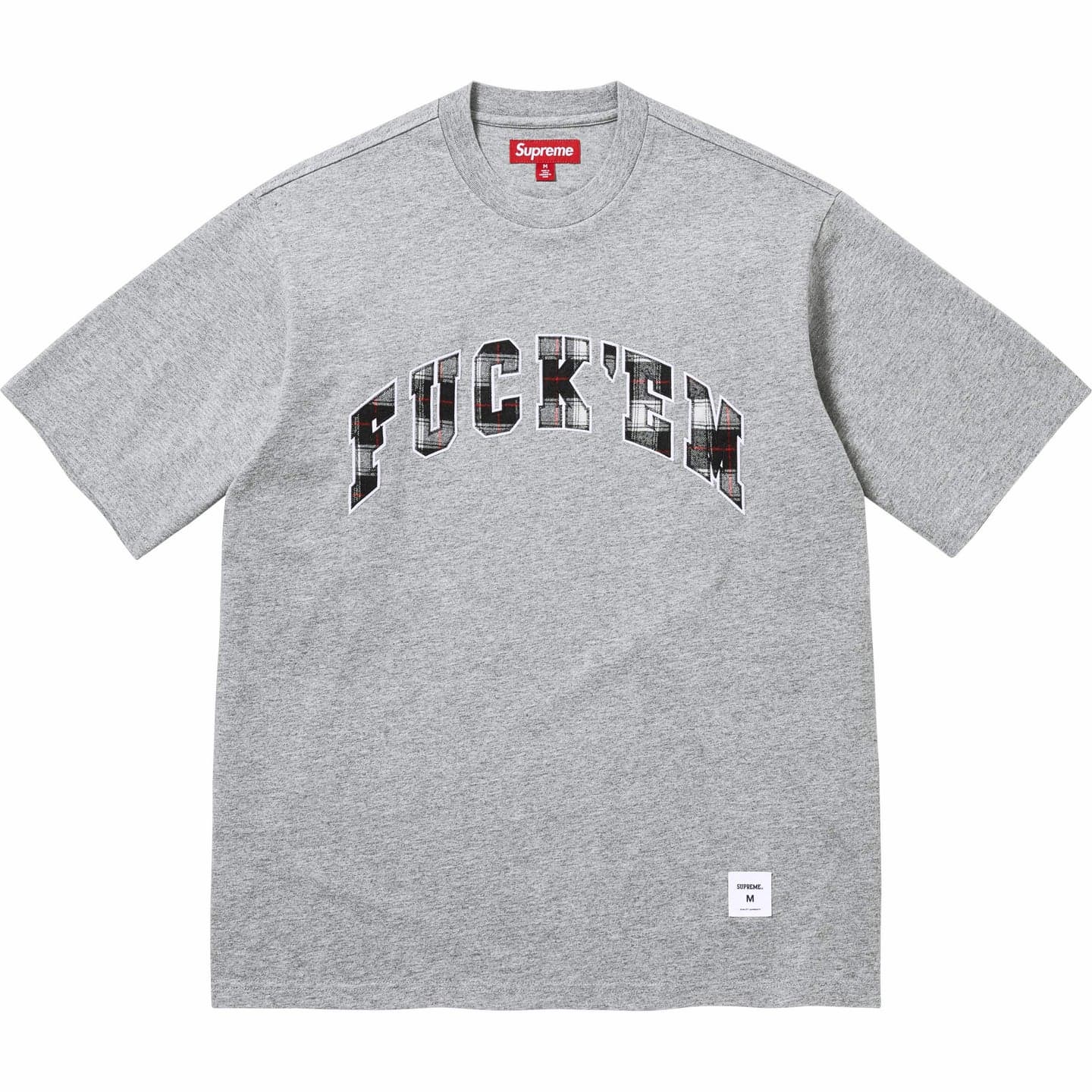 チェック模様の「FUCK EM」のテキストアップリケを施したコットンジャージTシャツ。