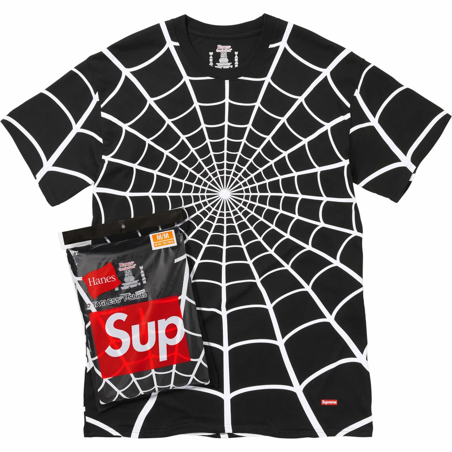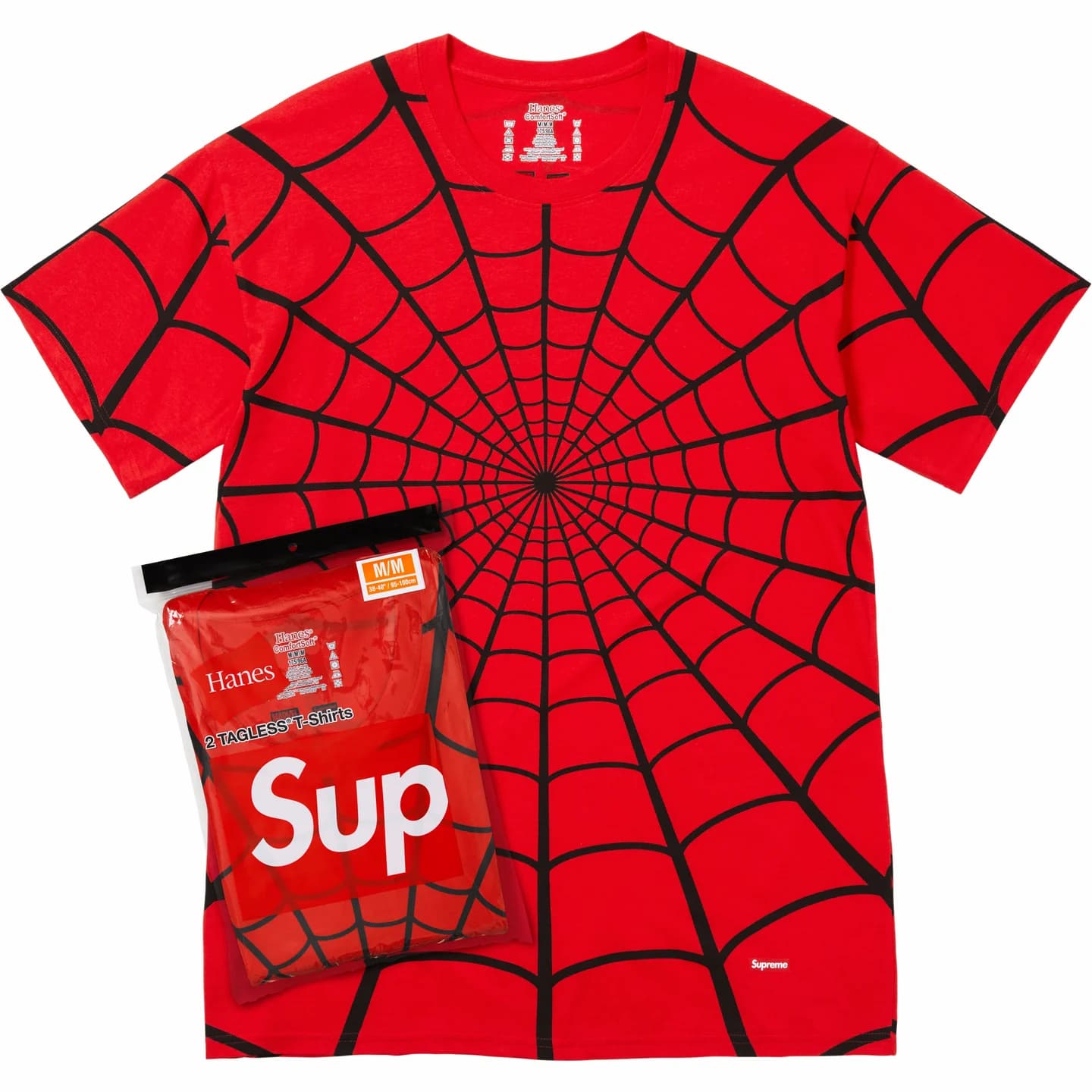 スパイダーマンとのコラボによる、蜘蛛の巣を全面プリントしたヘインズ製コットンTシャツ。
