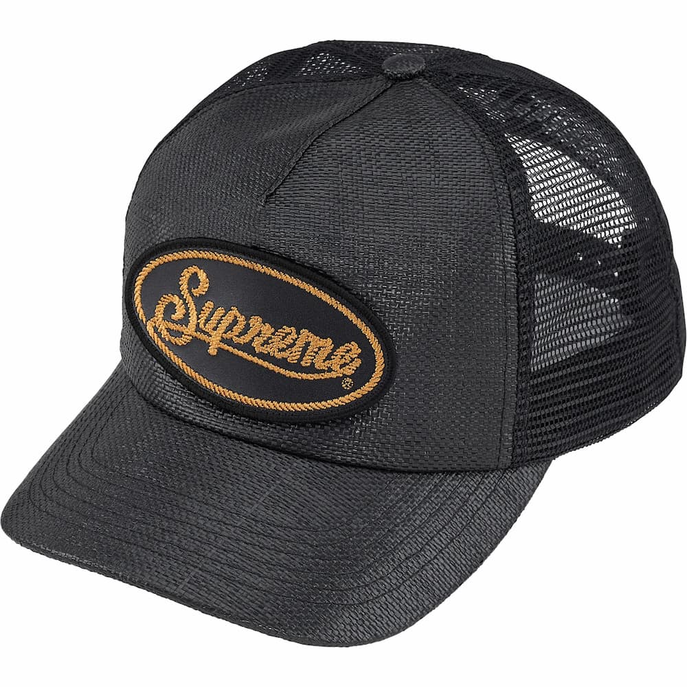 天然素材「ラフィアヤシ」の繊維をフロントからバイザーにかけて使用した涼しげな雰囲気のメッシュバック5パネルキャップ。