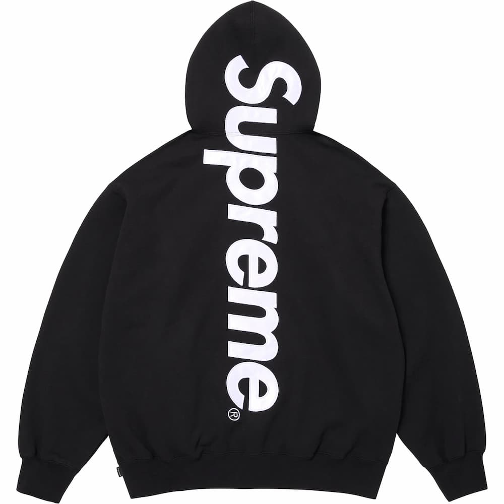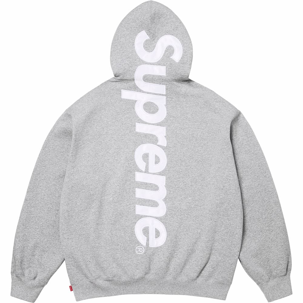 光沢のあるサテンのロゴアップリケをバックにデザインしたフーディ。