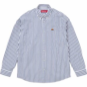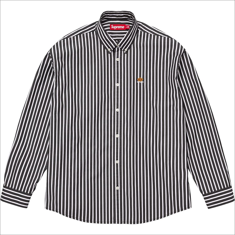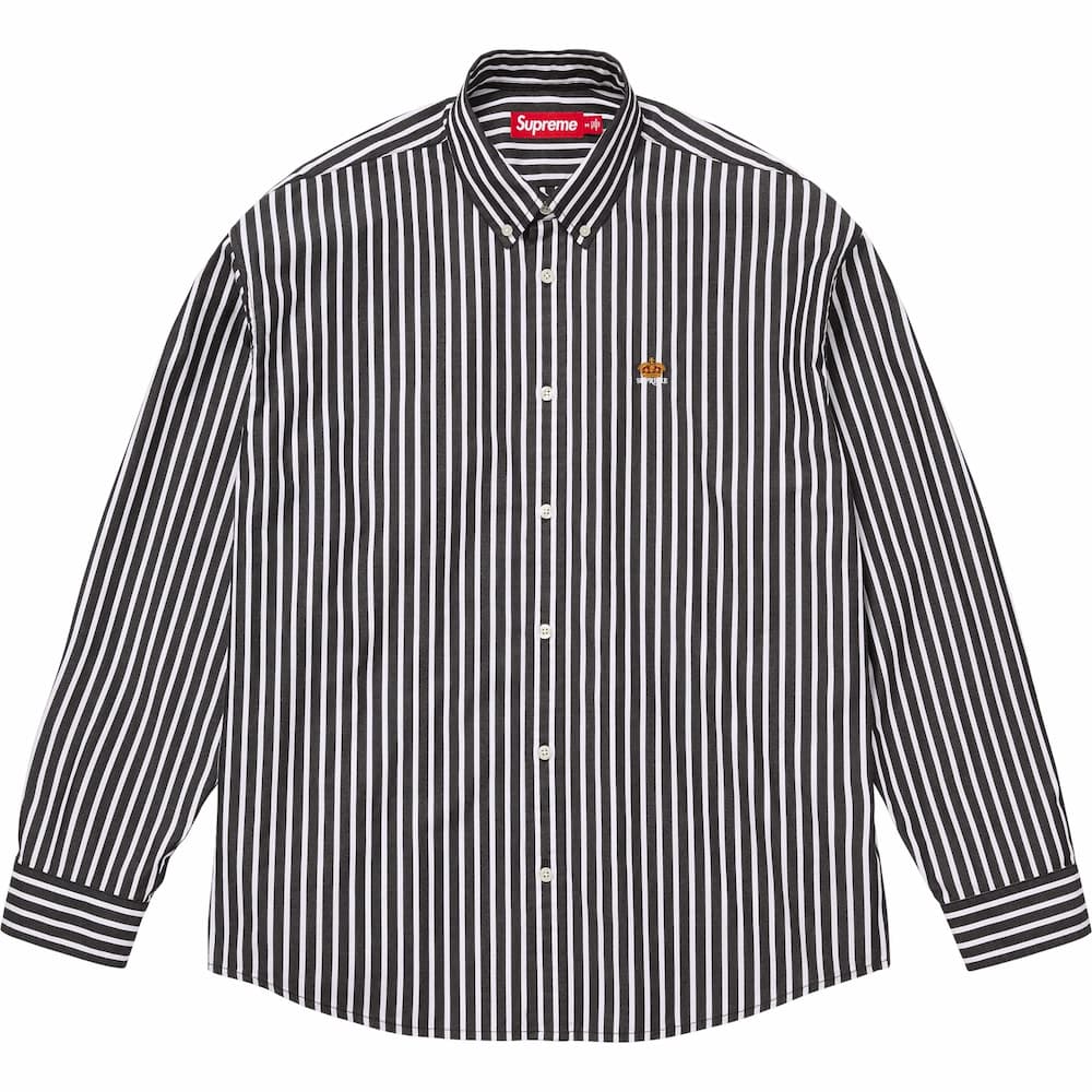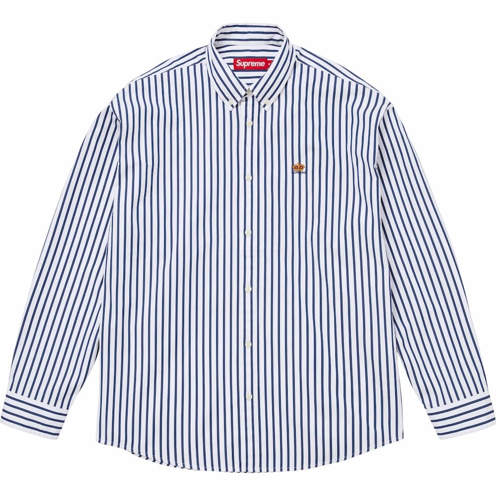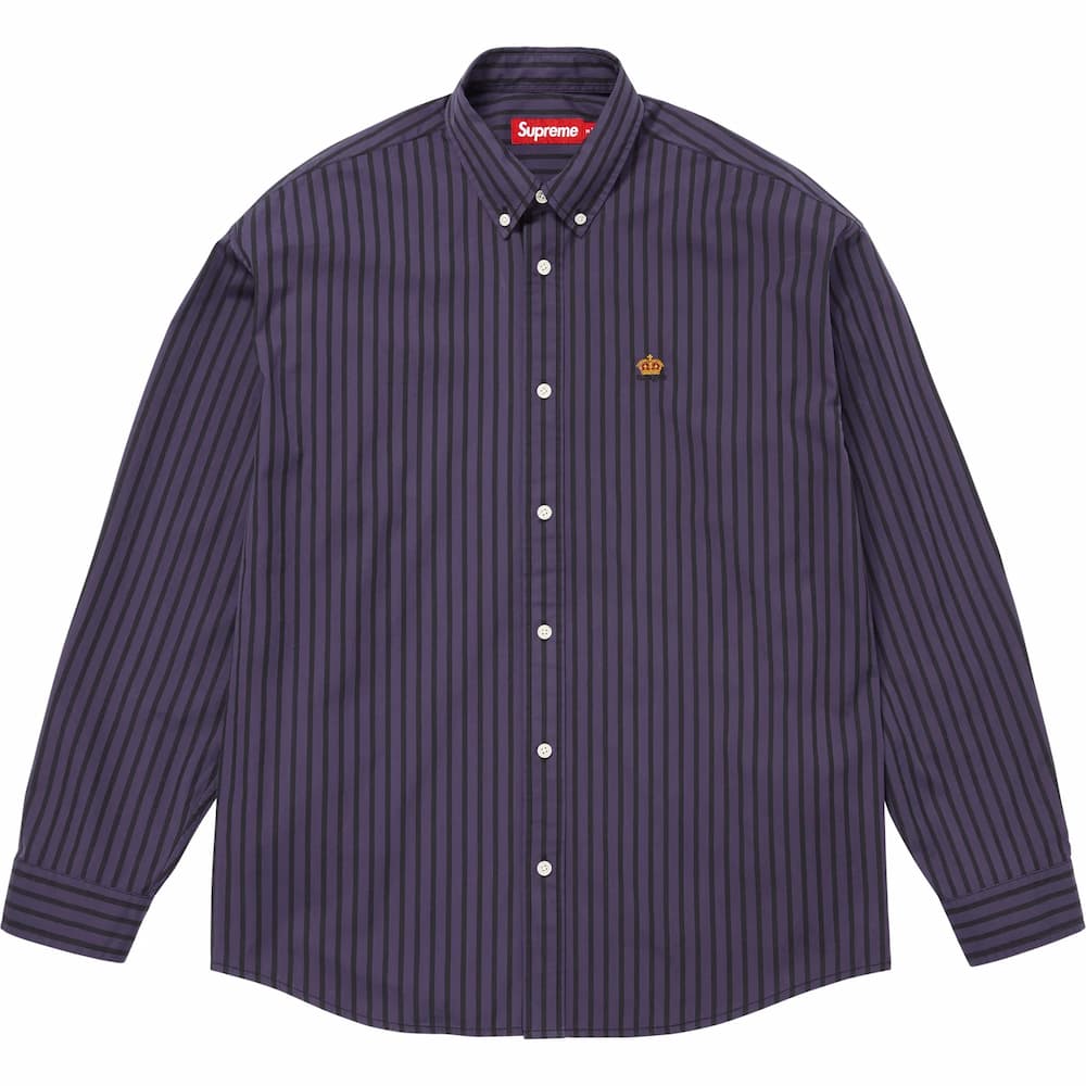 左胸にクラウンロゴを刺繍したコットン素材のストライプボタンダウンシャツ。
