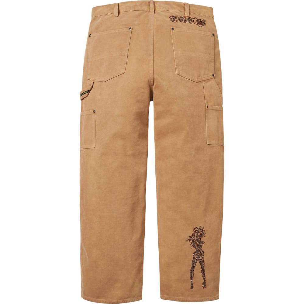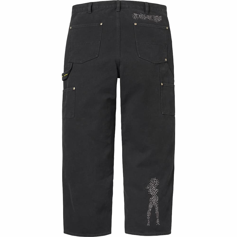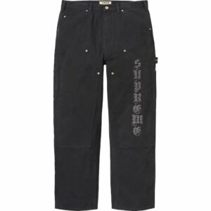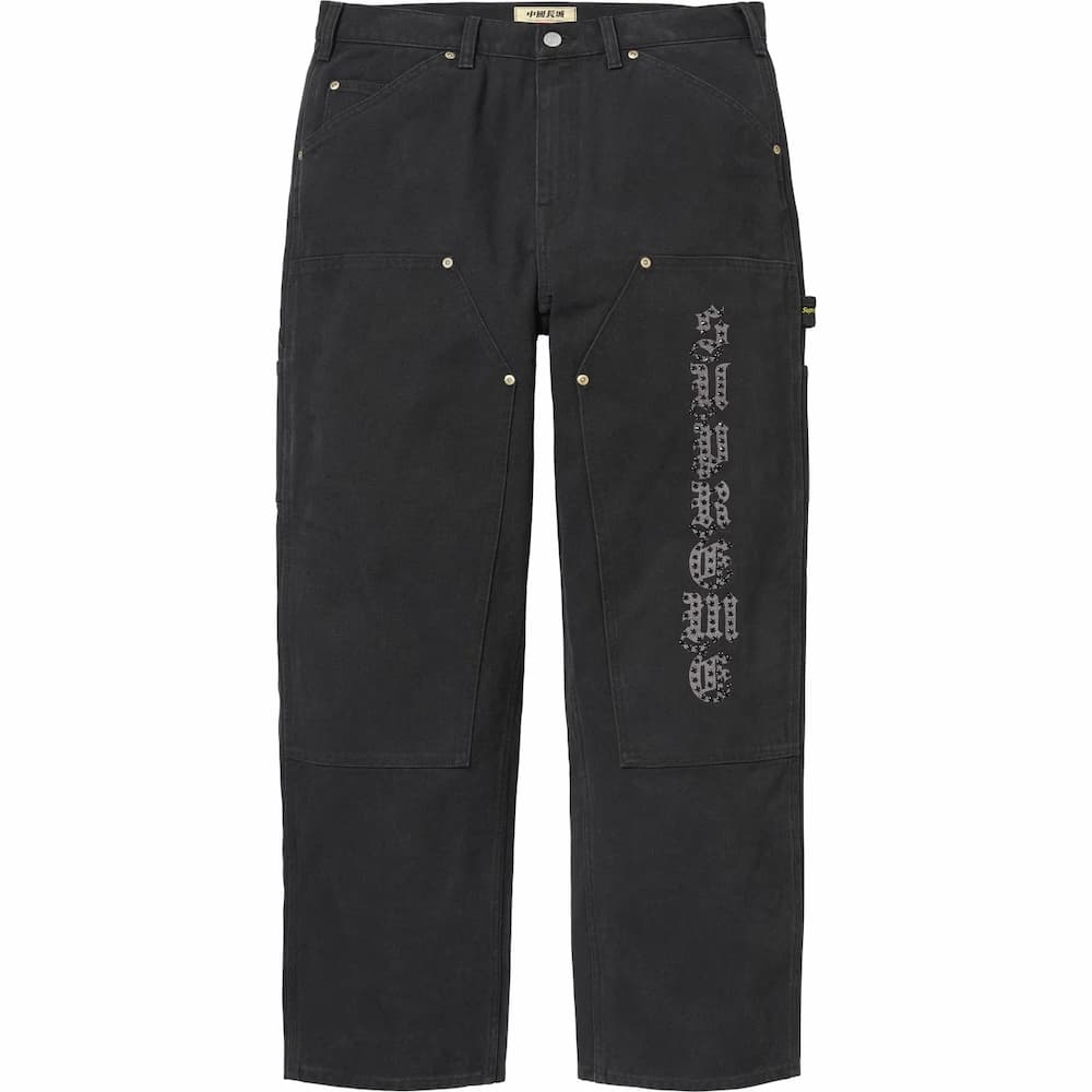 アメリカのブランド「ザ・グレートチャイナウォール」による、ラインストーン装飾のロゴとグラフィックを施したコットンキャンバス素材のダブルニーペインターパンツのセットアップ。