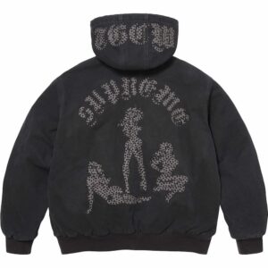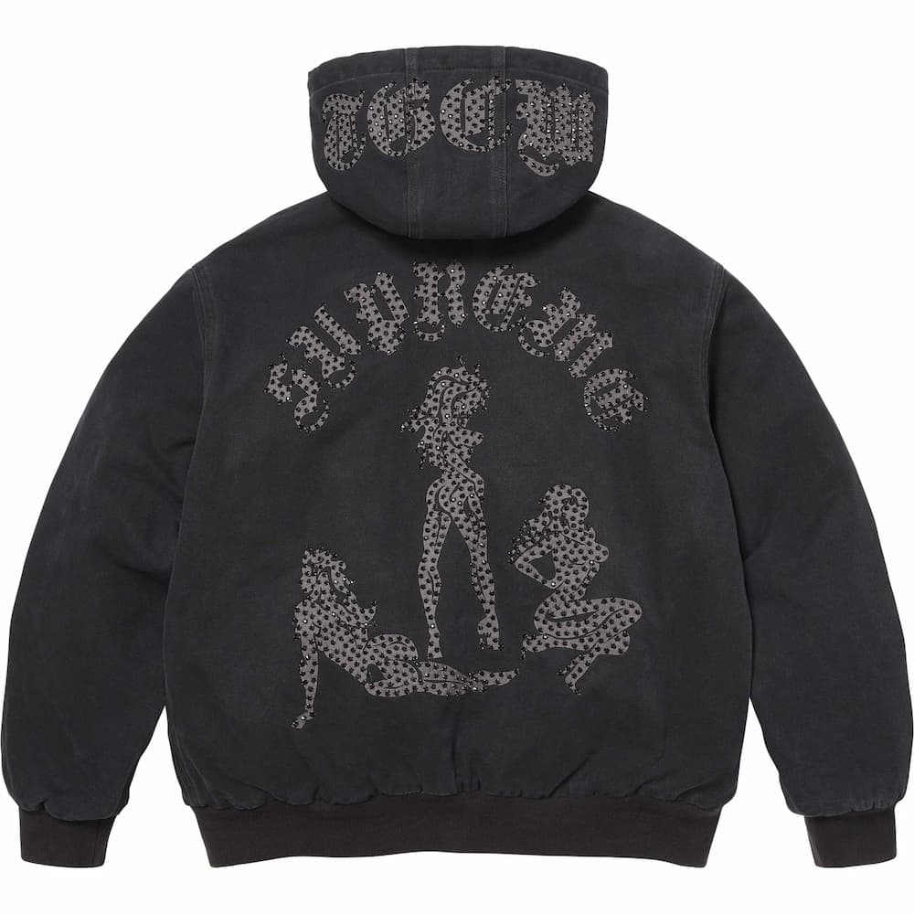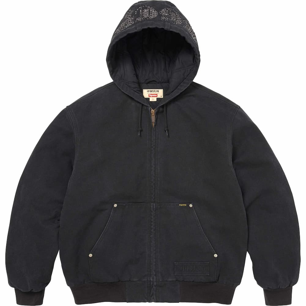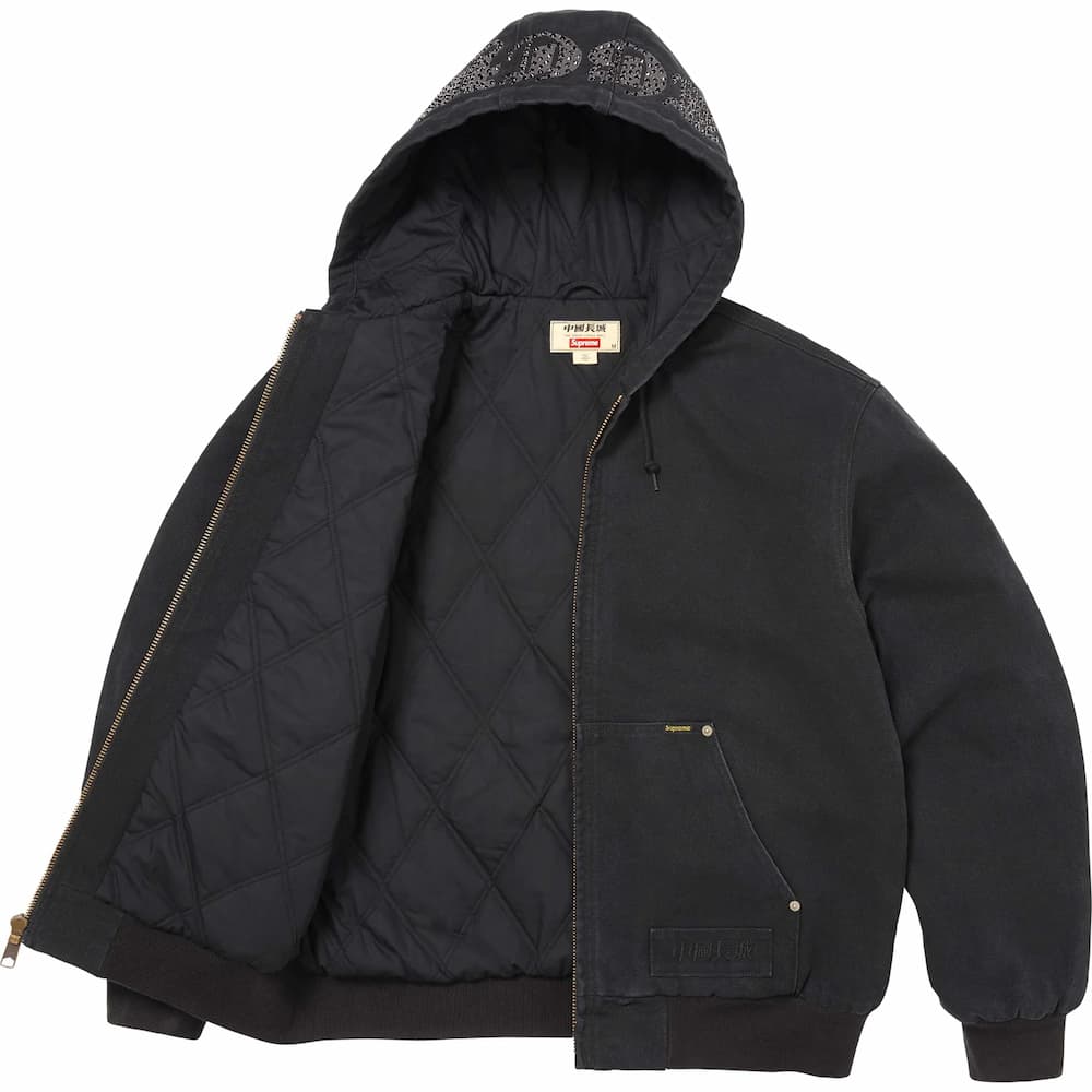 アメリカのブランド「ザ・グレートチャイナウォール」による、ラインストーン装飾のロゴとグラフィックを施したコットンキャンバス素材のフーデットワークジャケット。ジャケットの内側は3Mシンサレートとキルティングで保温性を高めてある。